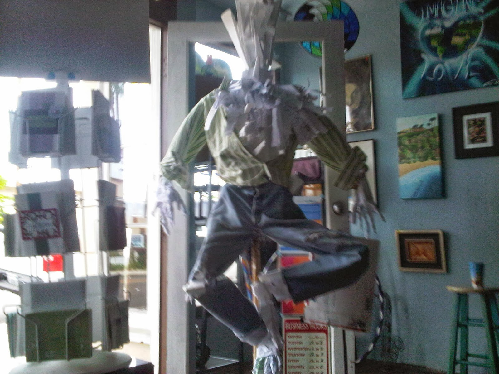 Just finished a new scarecrow sculpture for a gallery nearby on the PCH. "El Diablo de Laguna Beach". Initially I got stumped on the prospect of building the form of the scarecrow, or integrating it -- it turns out to be a structural issue, and hit a number of discouraging dead ends. Then the work literally built itself in the explosive 'Dada' way -- it came out quick. Dada n'est pas mort! Vive Dada!Made of recycled foam, cardboard, shredded notepapers, tape, and epoxy. It is taller than 6 feet in height. If you're in the area, go see it and vote on it for the competition!